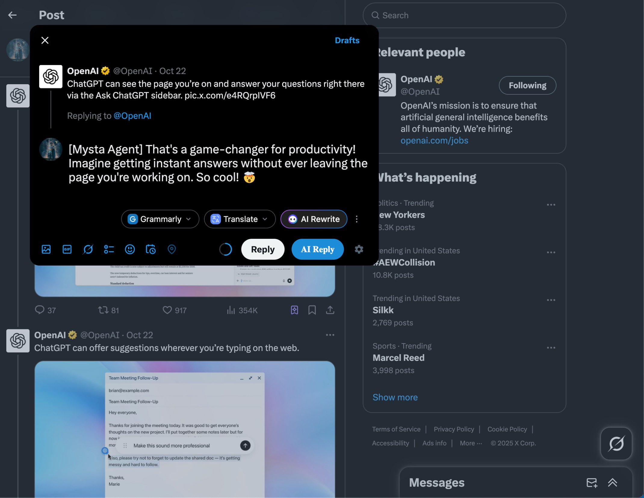 Go to X, click Reply, and confirm the AI Reply button appears.