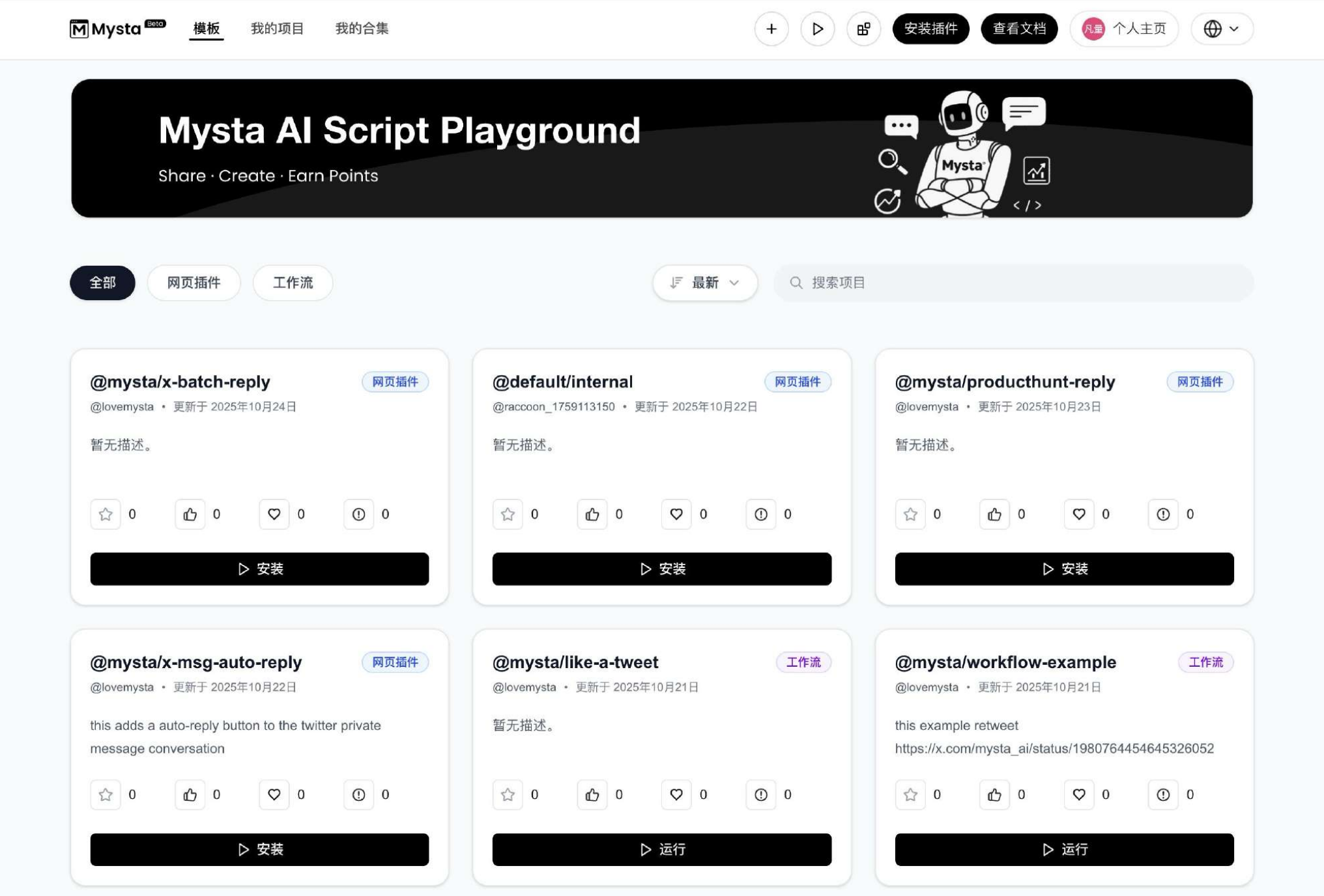 面板的导航分为「全部」「网页插件」「工作流」三类标签,并提供搜索与排序功能,方便快速定位所需能力。点击作品卡片即可查看简介、作者、更新时间以及收藏、点赞等互动数据。